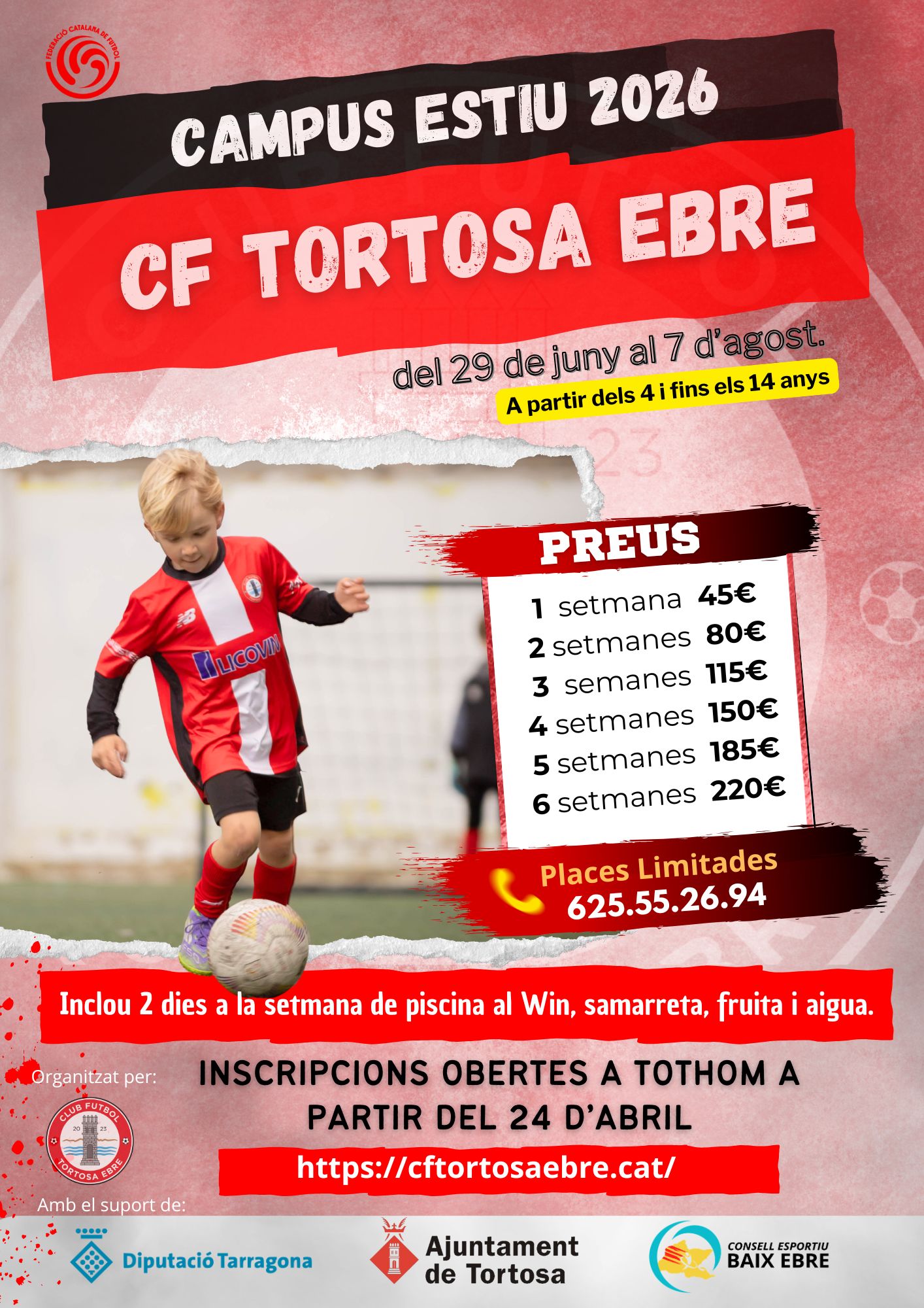 El Campus d’Estiu CFTE 2026 és el lloc ideal per a nens i nenes que vulguin millorar la seva tècnica de futbol, fer nous amics i refrescar-se durant les vacances. Les activitats es duran a terme a les instal·lacions del CF Tortosa Ebre amb l’objectiu de combinar l’esport amb la diversió màxima.